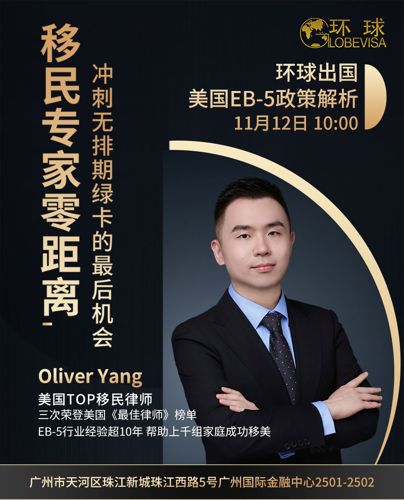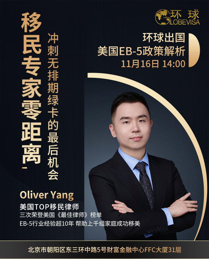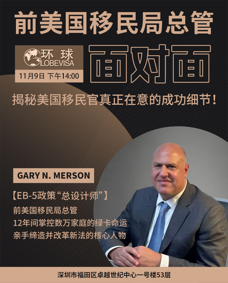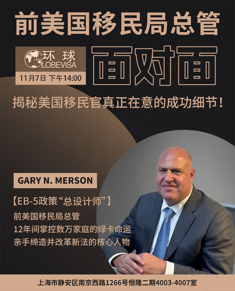 美国前移民局总管解读 EB5最新政策趋势 想知道美国移民官审核时最在意什么?前美国移民局总管、EB-5政策 “总设计师” Gary N. Merson面对面揭秘!12年掌管数万家庭绿卡命运,更是EB-5新法改革核心人物 苏州 | 南京 | 上海 | 深圳 | 广州 | 成都 | 青岛 | 北京 立即预约席位 环球出国美国EB5移民巡回活动 11月5日-11月9日 活动内容 前美国移民局总管 面对面揭秘! 移民官视角:揭秘EB-5审核内幕与成功法则 新法新机遇:解析EB-5排期迷雾与未来走向 风险和把控:剖析投资安全与绿卡保障策略 揭秘美国移民官真正在意的成功细节!苏州、南京、上海、深圳! 总有一站适合您!别错过近距离与移民官沟通的珍贵机会!! 在线咨询 11月12日-11月16日 活动内容 美国TOP移民律师 零距离解析! 美国EB-5TOP律师深度剖析热点问题! 优质的EB-5项目都具备哪些核心优势? 移民美国成功落地的核心关键是什么? 冲刺无排期绿卡的最后机会!广州、成都、青岛、北京! 总有一站适合您!别错过冲刺 “无排期绿卡” 的机会! 在线咨询 环球出国特邀 嘉宾介绍 加里•默尔森 Gary N. Merson 前美国移民局总管(Chief of Staff) 12年掌管数万家庭绿卡命运,更是EB-5新法改革核心人物 美国知名移民律师Oliver Yang 美国资深移民律师,从业经验超10年 他三次荣登《最佳律师》榜单,EB-5行业经验超10年,帮上千组家庭成功移美 2025年11月5日 14:00 环球出国苏州站 · 前美国移民局总管面对面 环球出国苏州公司 地址:苏州市工业园区苏州大道西9号中海财富中心西塔2306-2307室 在线预约 2025年11月6日 14:00 环球出国南京站 · 前美国移民局总管面对面 环球出国南京公司地址:江苏省南京市鼓楼区汉中路2号亚太商务楼19层B单元 在线预约 2025年11月7日 14:00 环球出国上海站 · 前美国移民局总管面对面 环球出国上海公司地址:上海市静安区南京西路1266号恒隆二期4003-4007室 在线预约 2025年11月9日 14:00 环球出国深圳站 · 前美国移民局总管面对面 环球出国深圳公司地址:深圳市福田区卓越世纪中心一号楼53层 在线预约 2025年11月12日 10:00 环球出国广州站 · 移民专家零距离 环球出国广州公司地址:广州市天河区珠江新城珠江西路5号广州国际金融中心2501-2502 在线预约 2025年11月13日 14:00 环球出国成都站 · 移民专家零距离 环球出国成都公司地址:成都市锦江区红星路三段1号国际金融中心2号办公楼1908 在线预约 2025年11月14日 10:00 环球出国青岛站 · 移民专家零距离 环球出国青岛公司地址:青岛市市南区香港中路2号海航万邦中心1109室(青岛世贸中心西侧) 在线预约 2025年11月16日 14:00 环球出国北京站 · 移民专家零距离 环球出国北京公司地址:北京市朝阳区东三环中路5号财富金融中心FFC大厦31层 在线预约 免费定制方案 立即预约 在线占位 全程贴心服务 祝您移路顺风 详细解读及了解更多移民活动,请咨询环球移民专家 姓名: 电话号码: 电子邮箱: 立即预约活动 姓名: 电话号码: 电子邮箱: 免费定制方案 环球出国往期精彩活动回顾 葡萄牙移民巡回活动回顾 美国EB5投资移民活动回顾 塞浦路斯移民全国巡回集锦 环球出国 品牌实力 环球出国全球业务布局,为想要实现全球梦的人士提供多元化的产品选择 全球50余家一体化服务机构 0 + 筛选超过100个项目供客户选择 0 + 帮助超11万组客户实现移民梦想 0 + 和百余位律师合作 0 + 服务超过114个国家和地区的客户 0 +