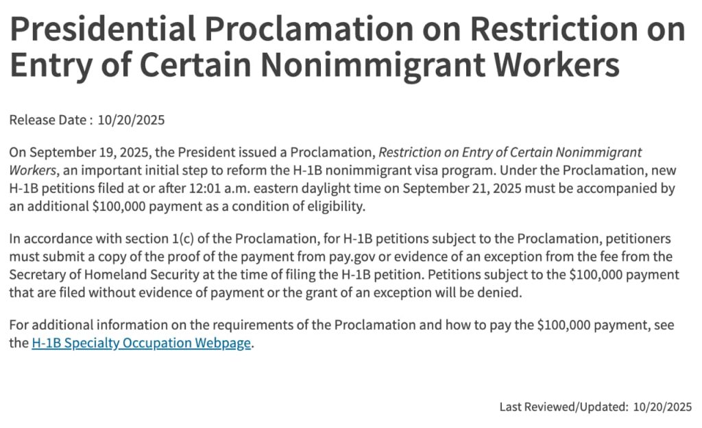 2025年10月20日,美国H-1B签证10万美元申请费正式落地,明确适用范围(目前面临诉讼)。