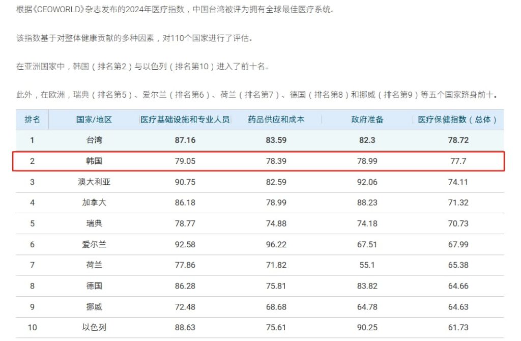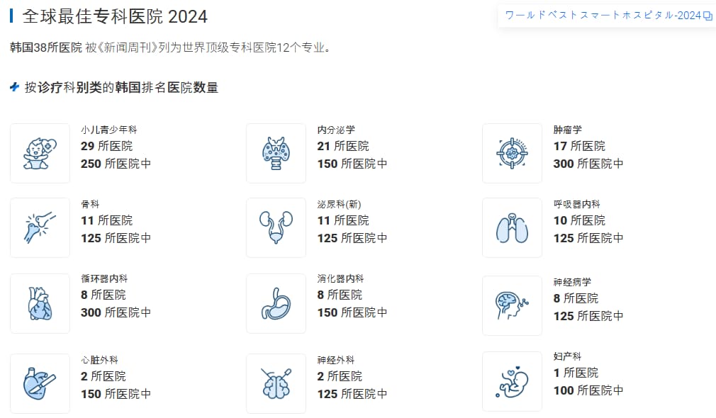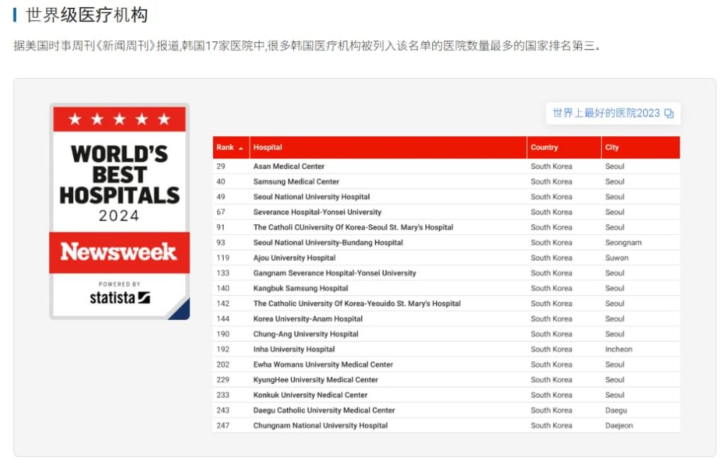 韩国医疗的国际竞争力不仅体现在全球排名上,还体现在各类权威榜单的表现。 据美国时事周刊《新闻周刊》报道,在其评选的世界优秀医院榜单中,韩国有17家医院入选,在被列入榜单的医院数量上位居全球第三。