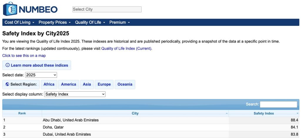 阿联酋是全球安全的国家之一,在 2025 年 Numbeo 全球城市安全指数中,首都阿布扎比位居第 1,迪拜排名第 3(安全指数分别为 88.8 与 83.8),双城同时跻身前三,充分体现了阿联酋在公共安全方面的国际前沿水平。阿联酋黄金签证使得一家人可以合法、长期地居住在这里,还能充分享受城市的高品质生活。