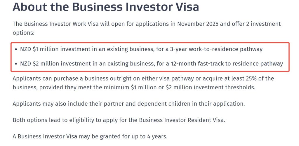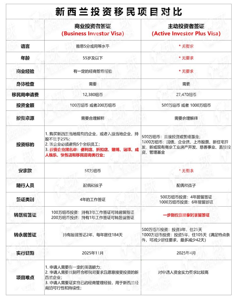 商业投资者签证:工作签证,其中100万纽币投资持有满3年可以转居留签证,200万纽币投资持有满12个月可以转居留签证。拿到居留签证满2年,每年住满184天后才可以转永居。