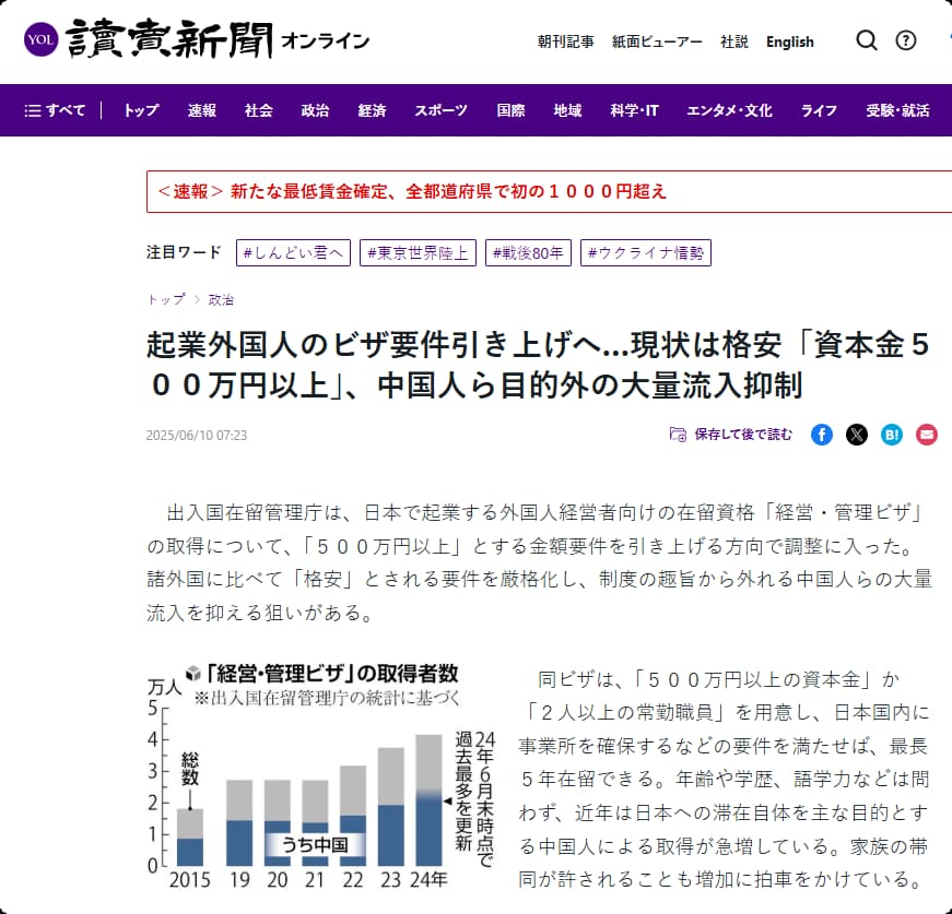 讀賣新聞2025年6月发文,标题《外国企业家签证要求将提高……目前‘资本金500万日元以上’要求较低,以遏制大量中国和其他外国人的涌入》,直接点名中国申请人。