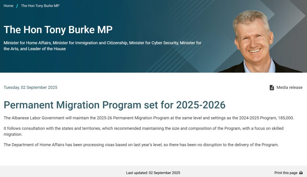 澳洲移民部长 Tony Burke 于 9 月 2 日正式官宣:2025-26 财年澳大利亚永久居民(PR)签证总配额维持在 18.5 万个,与上财年持平。