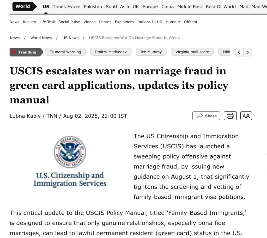 除了全面打击非法移民以外,针对合法移民类别的审核也升级加码,这导致很多过去可能存在“灰色空间”而被别有心思的人利用的政策,在未来将面临着严重后果,其中就以“婚姻绿卡移民”首当其冲!