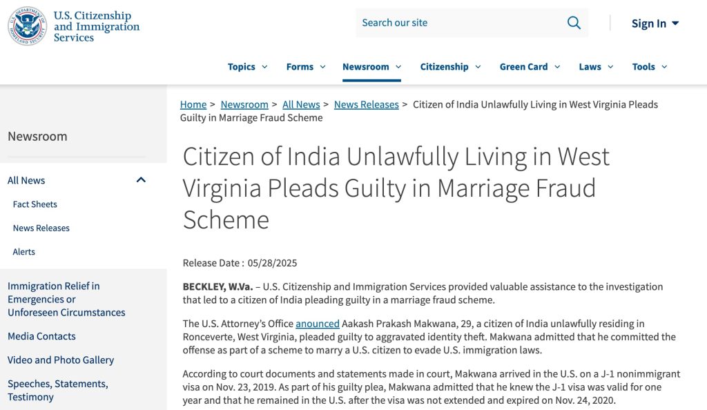 2025年5月,据美国检察官办公室披露,印度公民阿卡什·普拉卡什·马克瓦纳(Aakash Prakash Makwana)因婚姻虚假罪认罪并被定罪。她曾持J-1交流访问签证逾期滞留,为了获得绿卡,通过虚假婚姻,伪造了租房和水电费账单等共同居住文件,甚至谎称自己是家庭暴力的受害者,企图利用《暴力侵害妇女法》来获取移民福利;马克瓦纳面临监禁、罚款并被遣返的严重后果。