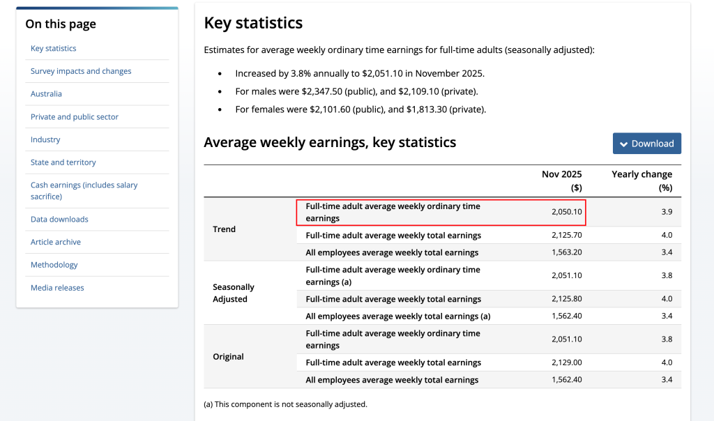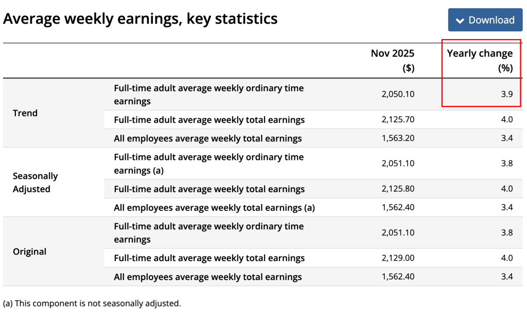 来源:Australian Bureau of Statistics|Average Weekly Earnings, Australia, November 2025