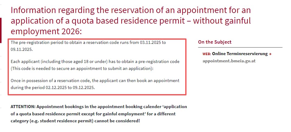 2025年10月16日官方发布!奥地利驻华大使馆公告:2026年度“配额居留许可”在线预约系统将于2025年11月3日9:00至9日9:00开放预注册,只有在此阶段成功获取“预约码”的申请人,才能在12月2日至9日期间正式登录系统,抢订具体前往使领馆递交纸质申请的时段,先到先得。这两个核心阶段,环环相扣,缺一不可。