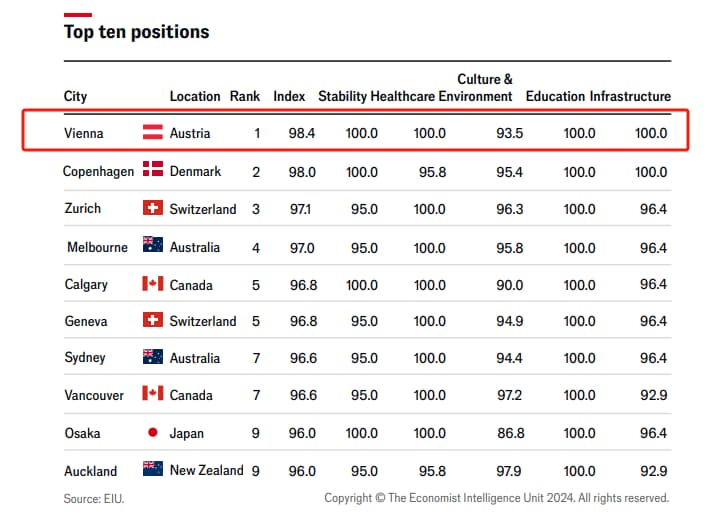 首都维也纳连续十年位居全球宜居城市榜首,其在医疗、教育、安全、环境等维度的评分近乎满分。