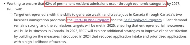 而在阐述如何实现“62%”的宏大目标时,IRCC报告明确指出,将“通过加拿大的两大商业移民项目:创业签证(Start-Up Visa Program)和自雇移民项目(Self-Employed Program),重点吸引有能力在加拿大创造财富和就业的企业家。”