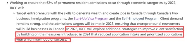SUV项目以其独特的项目优势,精准回应了加拿大政府对创新经济的渴求,也完美地匹配了企业家们的核心诉求。当然,报告中除了明确济类移民的重要性和点名SUV项目,IRCC的报告还透露了一个关键的审理趋势。报告提到,将在2024年措施的基础上,于2025年继续探索新策略以“优先处理高成功率的申请”。