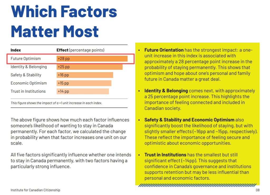 对于加拿大而言,吸引并留住这些拥有“对未来的乐观”和强烈“身份认同与归属感”的新移民,尤其是具备创新精神和创业潜力的个体,至关重要。这些创业者是推动经济增长、创造就业、引入新思想和技术的重要力量,他们的长期扎根直接服务于加拿大社会和国家的长远发展需求。