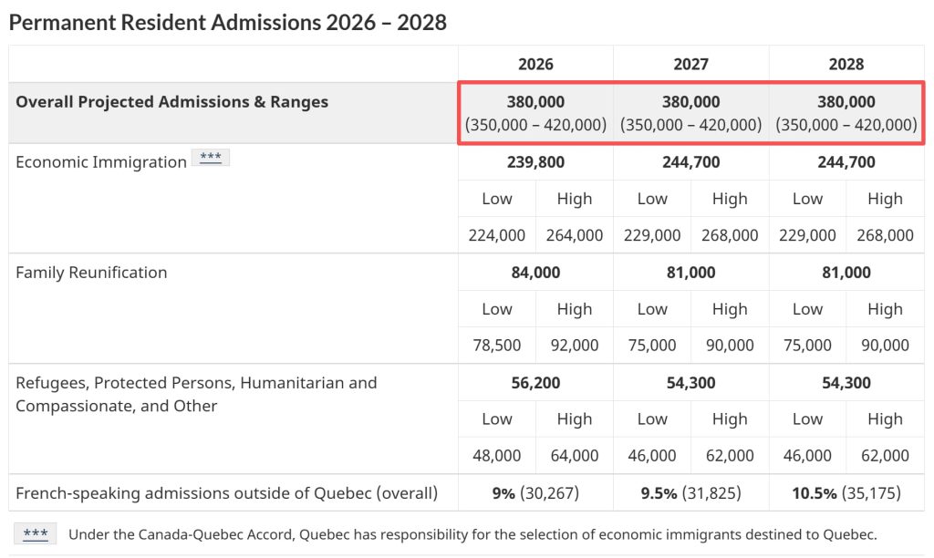 根据实时公布的预算案,虽较2025年的永久居民计划总数39.5万人略有下降,但永久居民的接纳目标仍保持稳定,2026年至2028年加拿大将持续保持纳入380,000名永久居民。
