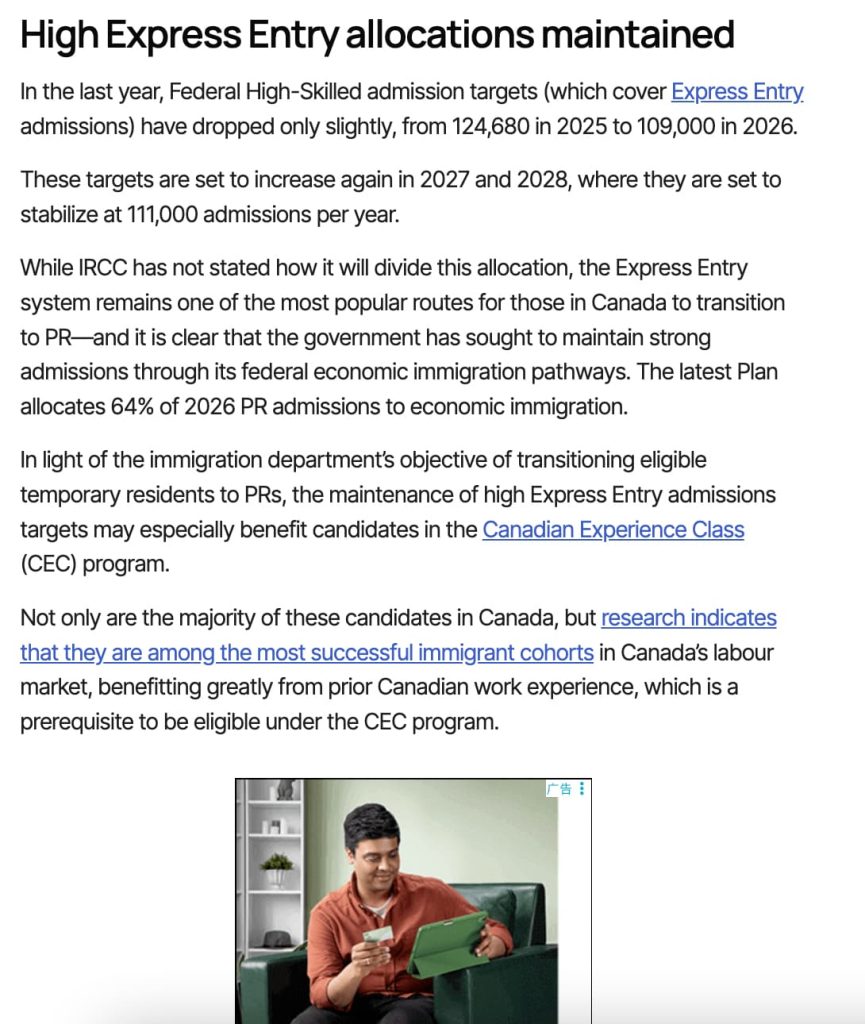 数据显示,2025年已有40%的新永久居民来自境内临时居民。EE快速通道对“加拿大经验类(CEC)”申请人的定向抽签,以及省提名对境内申请人的优先审核,都让硕士毕业生的移民之路更稳健。
