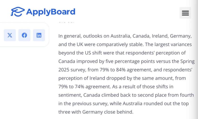 ApplyBoard的报告揭示了留学生的核心择校逻辑,而加拿大的优势恰好与之高度契合: