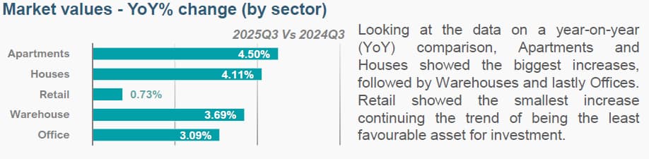 数据显示,截止2025年11月,塞浦路斯房产交易量比去年同期增长了9%。共售出1644 套房产,高于2024年11月的1506份。同时,住宅类房产价格同比去年也有大幅上涨,与去年同期相比(YoY%),所有主要房产类型的价值都在上升。对于我们的移民客户来说,住宅类资产表现抢眼: