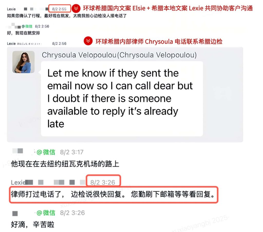 紧急情况下,我们的全球支持网络被瞬间激活。环球雅典的内部律师Chrysoula迅速对接希腊边检;另一边,环球希腊国内文案Elsie与希腊本地文案Lexie不分昼夜,即使在凌晨时分也通力协作,指导客户与美国地勤沟通,并同步规划新航线。凭借多方无缝联动,我们很快获得了希腊边检的即时确认,确保客户家人顺利抵达。