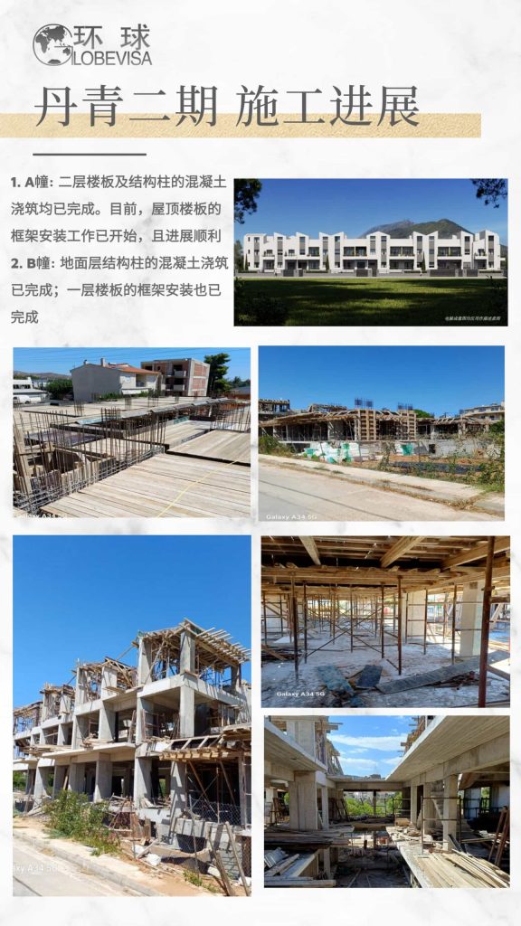1. A幢:二层楼板及结构柱的混凝土浇筑均已完成。目前,屋顶楼板的框架安装工作已开始,且进展顺利。