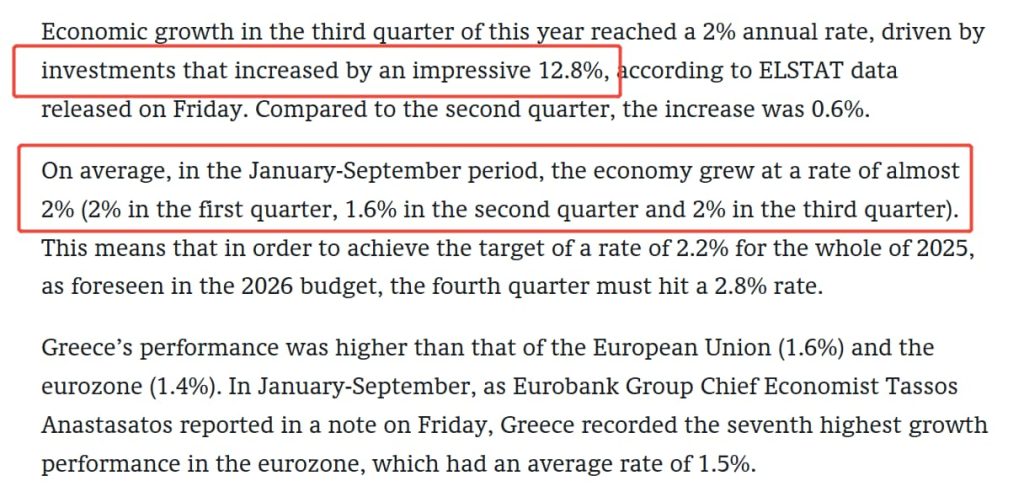 2025年第三季度,希腊整体经济表现强劲,增长率达到2%,这一数字明显优于欧盟(1.6%)和欧元区(1.4%)的整体水平。其中12.8%的投资增长成为拉动复苏的主要引擎,0.6%的环比增长也显示出资本的持续信心。