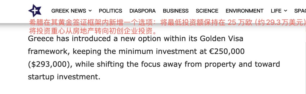 紧接着,希腊主流媒体《Greek Reporter》同步披露:政府自 2026 年起,将新增25万欧元初创企业投资移民通道 —— 看似是政策扩容,实则是把投资重心从房地产转向创业领域。