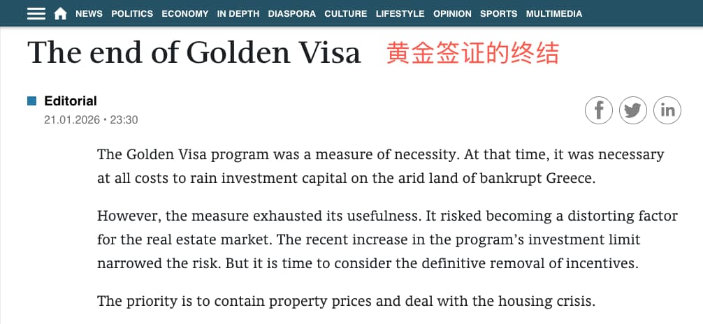 先是希腊较具影响力的英文日报《Ekathimerini》发布《黄金签证的终结》新闻,引发全球投资者对政策走向的深度担忧。