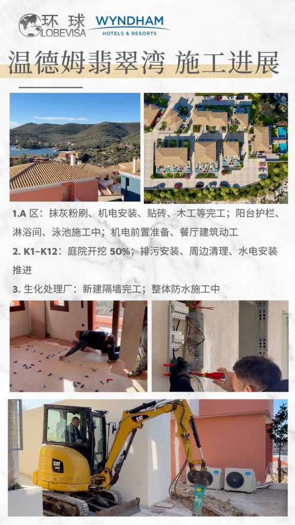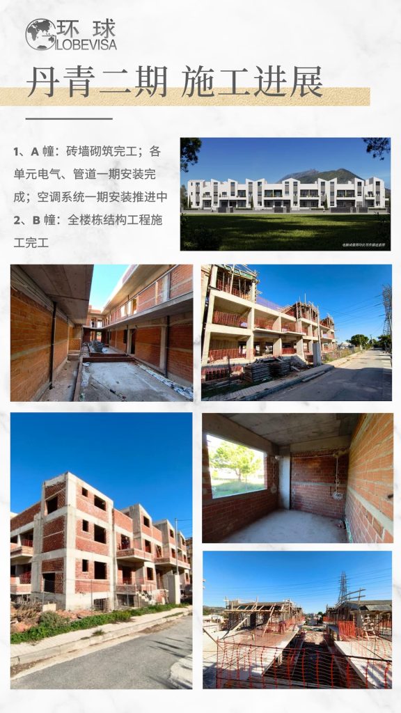 A 区:抹灰粉刷、机电安装、园林覆土、门窗内外框安装、贴砖、木工等完工;阳台护栏、淋浴间、泳池施工中;机电前置准备、餐厅建筑及基建动工。