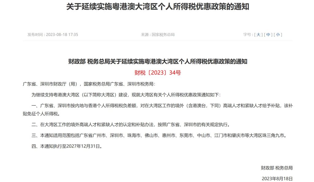 根据国家财政部、税务总局《关于延续实施粤港澳大湾区个人所得税优惠政策的通知》内容,结合(粤财税〔2023〕21号)文。
