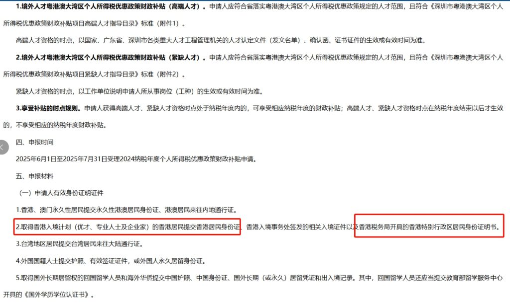 3、我通过高才通/资本投资者入境计划拿到了香港居民身份,可以申请大湾区个税优惠政策补贴吗?