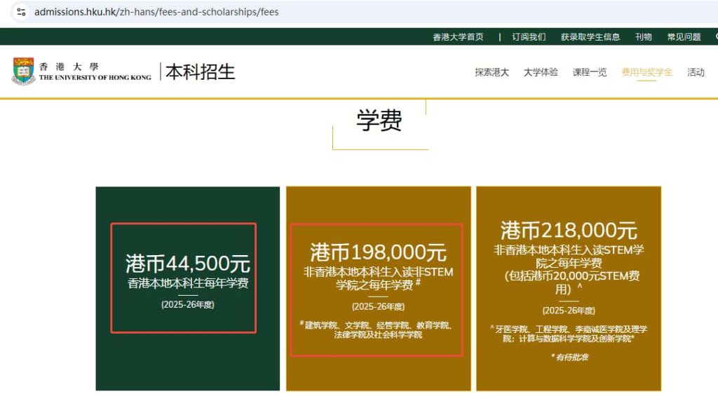 2、本科学费:下图举例,香港大学录取本地生的学费为每年为44500港币,而非本地生学费为198000港币,相差了153500港币。香港中文大学录取本地生的学费每年为44500港币,而非本地生学费为178000港币,相差了133500港币。