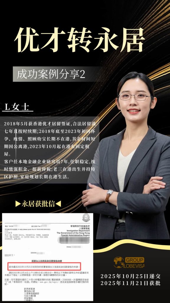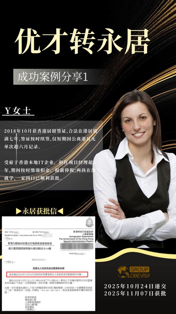 居留基础:2018年10月获香港优才居留签证,合法居满7年,签证按时续签,无任何违规记录,家庭与香港深度绑定。