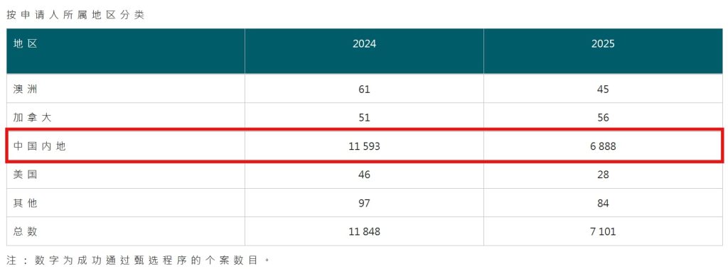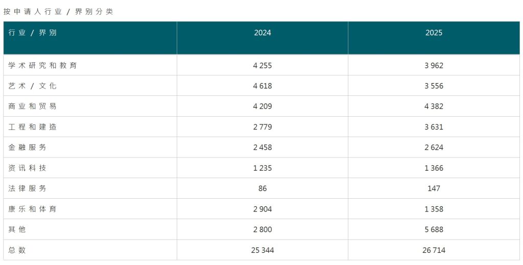 非本地生留港/回港就业计划(IANG)2025年获批27,630人,与2024年的25,475人基本持平,且略高于2023年水平。作为港校毕业生留港工作的核心通道,IANG计划保持高度稳定性,仍是香港“育才+留才”体系中的重要一环。