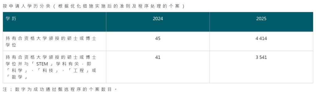 学历相关数据层面,入境处做出调整,不再对外公布非名校硕博学历的获批人数。数据显示,2025年获批的优才申请人里,约 62% 持有合资格大学的硕博学位,其中八成学历与 STEM 领域相关。