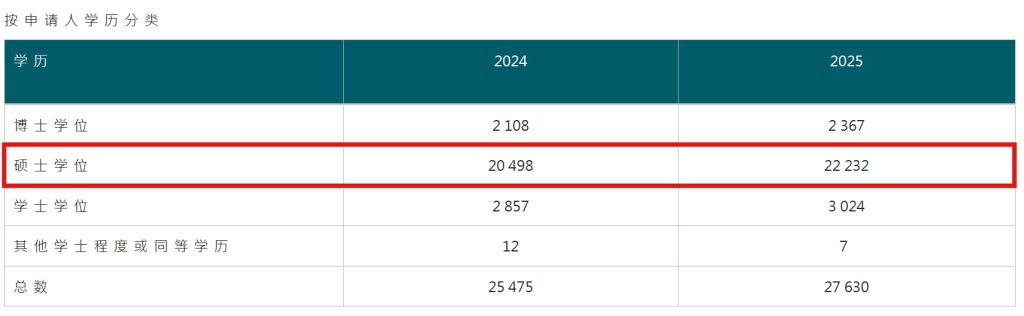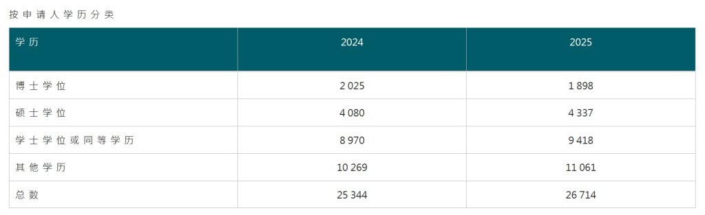 从学历分布看,硕士学位毕业生是IANG留港的明显主力——2025年获批22,232宗,占比高达80.5%,较2024年进一步攀升。博士学位占比8.6%,学士学位占比10.9%。