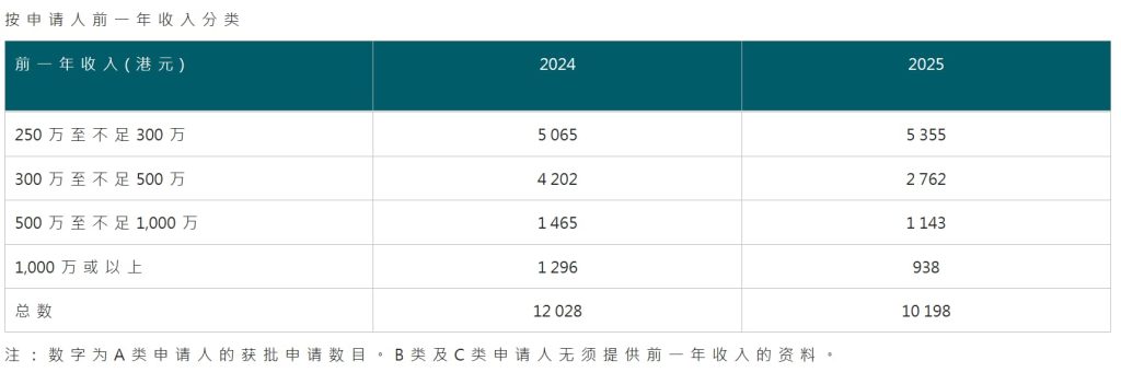 高才通计划主要面向两类人群:高年薪群体(A 类) 与高学历群体(B、C 类)。其中A类(即:年收入250万港币及以上)2025年获批10,198宗,占高才通总获批数的32.36%。值得关注的是,250万至300万港币区间的获批者占比从2024年的42.1%跃升至2025年的52.5%,成为A类中独特实现正增长的区间,其余收入段获批数量均呈下滑趋势。
