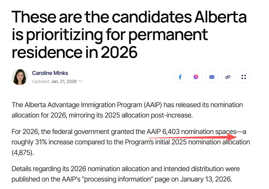加上阿省这两年省提名移民项目的政策又是比较宽松的,省提名移民配额也是在所有省份中排名靠前的。2026年,阿省获得了 6,403个 省提名配额,相比2025年初的4,875个,大幅增长了31%。这不仅体现了联邦政府对阿省吸纳移民能力的认可,也为申请人提供了更广阔的窗口。