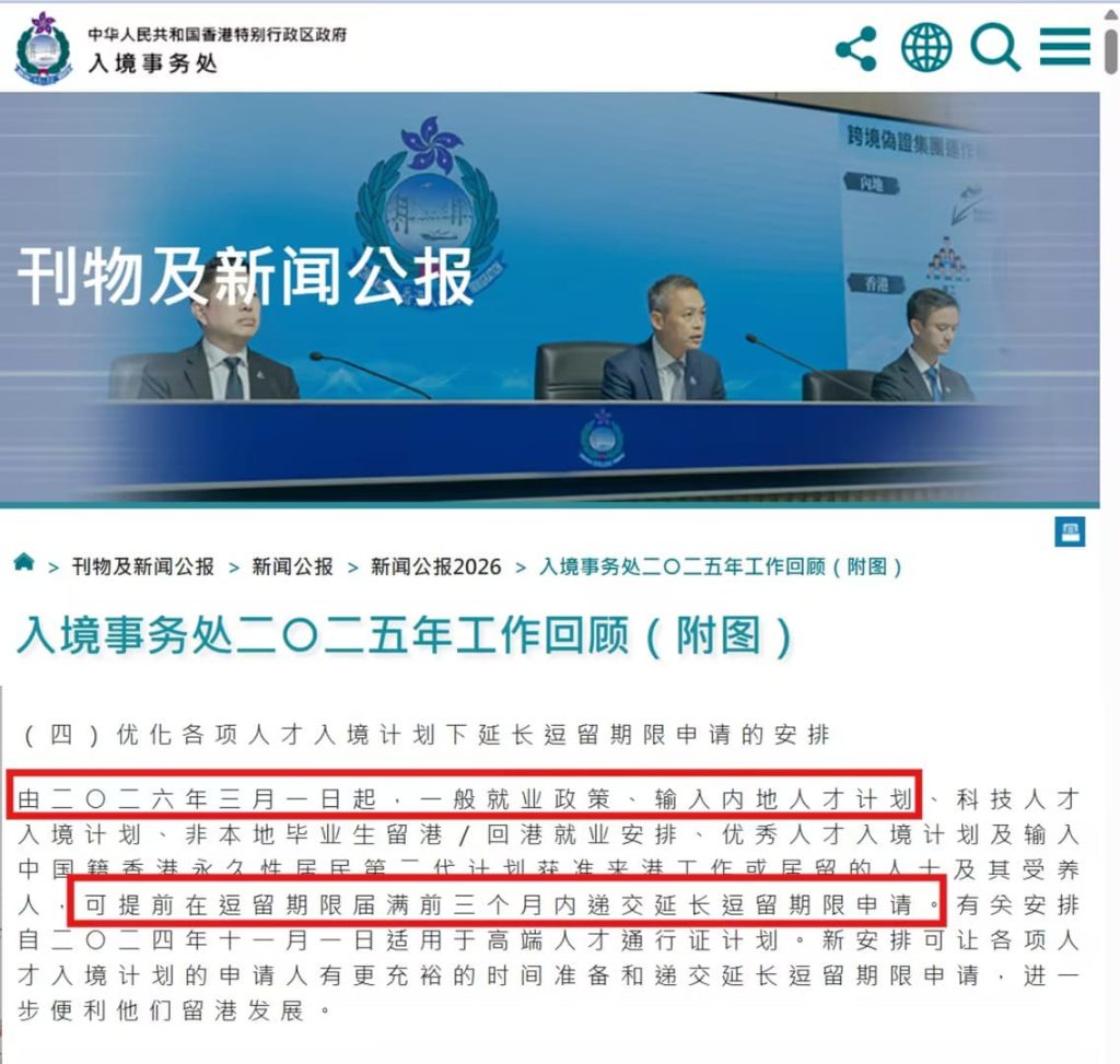 根据香港入境事务处2026年3月发布的新闻公报,自2026年3月1日起,包括专才计划在内的多项人才计划,延长逗留期限申请的递交时间放宽至届满前3个月内。