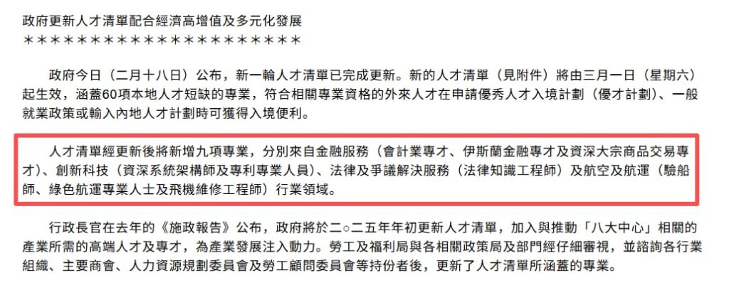 2025年3月1日起,香港人才清单从51项扩展至60项,新增专业包括: