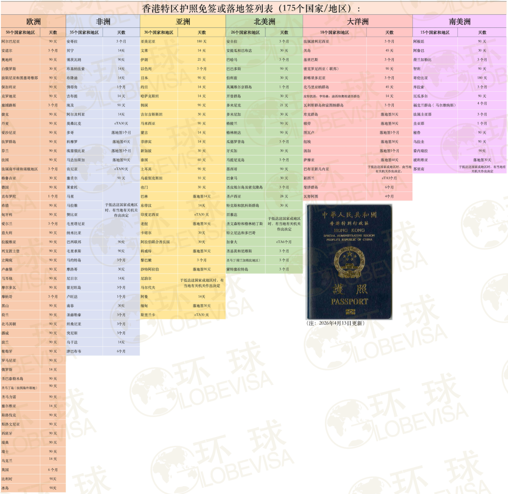 截止到 2026 年 4 月 13 日,中国香港特区政府公布,中国香港特别行政区护照持有人可享有的免签或落地签入境待遇已正式增加至 175 个 国家及地区。