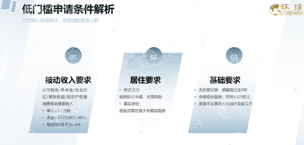 意大利作为“欧盟+申根+欧元区”三位一体的发达国家,其非盈利签证以零投资、高福利、强灵活为核心优势,成为追求品质生活家庭的优选方案,官方申请条件清晰透明,适配多元人群需求:
