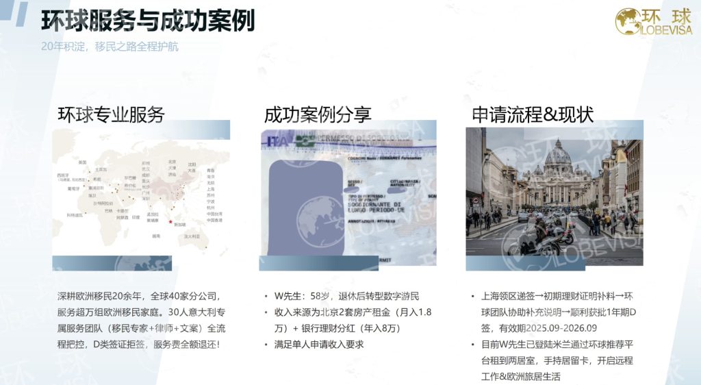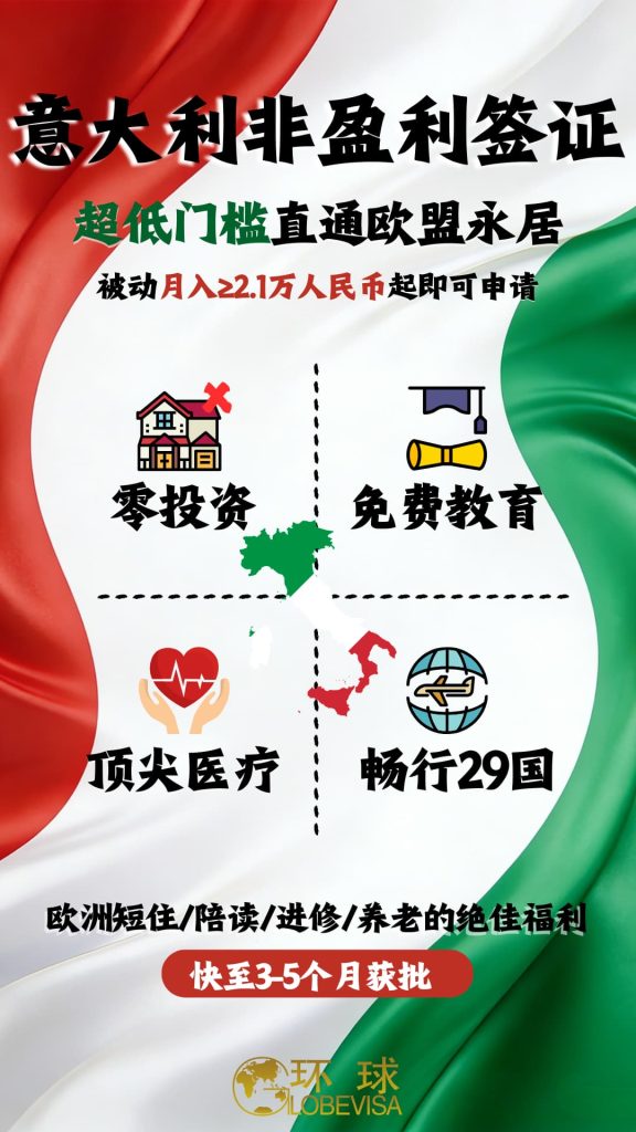 事实上,意大利选择性居留签证(即非盈利居留签证)的政策本质,从未将“购房”列为必要条件。作为国内头部移民机构,环球出国秉持专业与透明的行业担当,深度解读政策核心,以无购房强制、低门槛、高自由度的纯签证服务,为渴望移居欧洲的家庭,开辟一条真正契合 “经济独立、灵活宜居” 需求的高性价比之路。