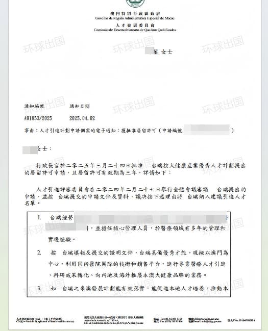 初步批复:纳入建议引进人才名单,并预约前往澳门核实文件原件,并同步办理澳门非永久性居民身份证。
