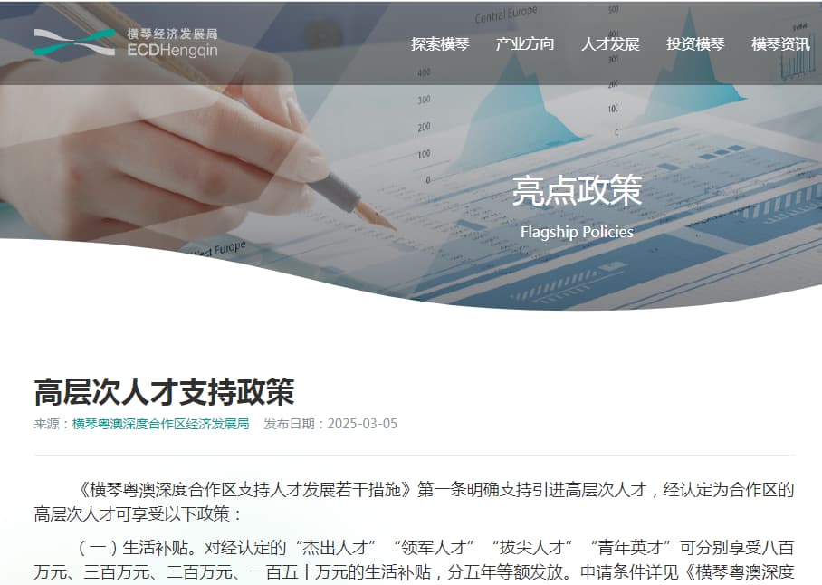 琴澳红利:合作区对 “杰出人才”“领军人才” 分别给予高至 800 万元、300 万元生活补贴,创业项目可获较高 1 亿元资助,子女教育一次性补贴较高可至30万元。