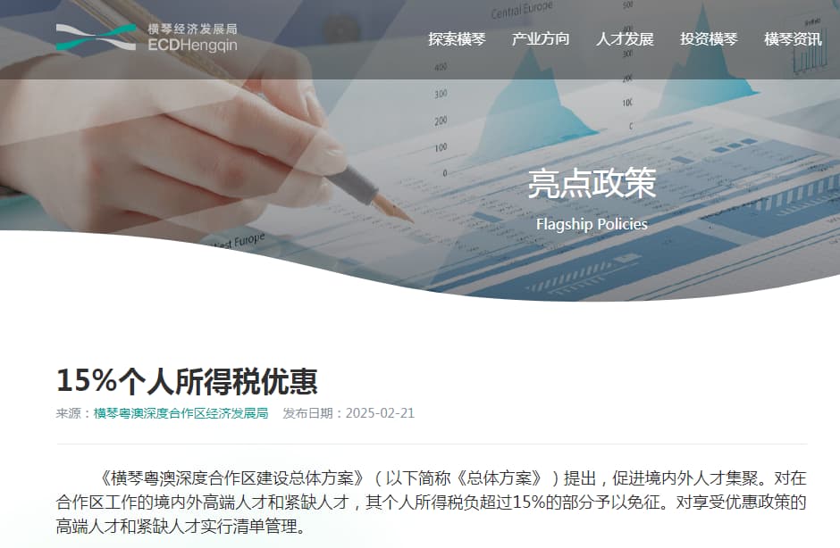 琴澳协同:在横琴粤澳深度合作区工作的人才,个人所得税负超过 15% 的部分予以免征。