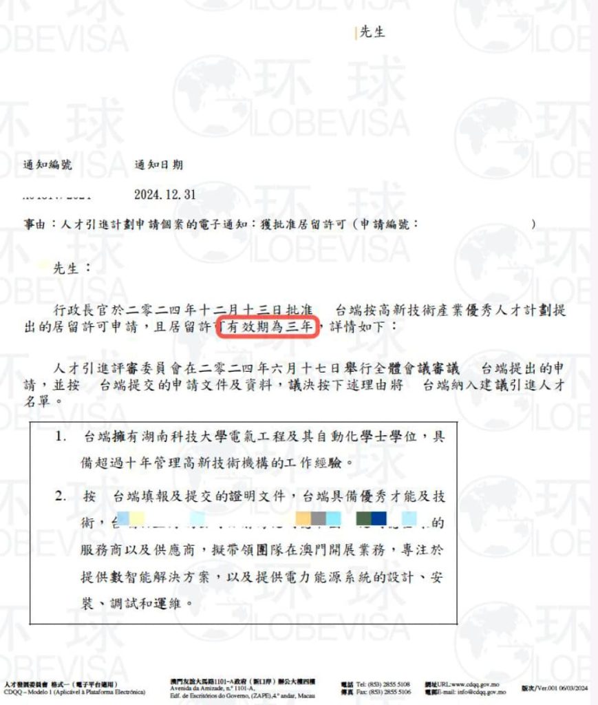 结合我们大量实操成功案例来看,澳门优才审批效率稳定、路径清晰,我们的成功案例显示: 一位在上海从事电气自动化相关领域的高层管理者,根据所属行业可以匹配高新技术领域,同时在一家表现优异机构任职近10年,有着丰富的行业经验,年薪超300万人民币,通过打分有230分,通过优秀人才计划申请,凭借在高新技术领域方面的专业经验,仅用时1年就获批澳门居民身份。