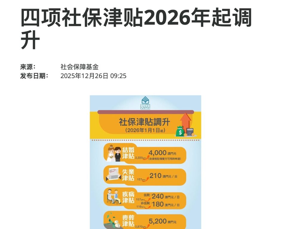 2026年1月1日起,澳门社保体系中的多项津贴同步上调:结婚津贴提升至4,000澳门元,失业津贴升至210澳门元/日,住院疾病津贴达240澳门元/日,丧葬津贴提高至5,200澳门元。这些“资金”的民生政策背后,其实隐藏着一个更大的命题:当澳门不再依赖经济多元化转型,这座城市未来靠什么来支撑高福利?