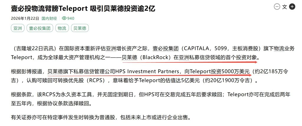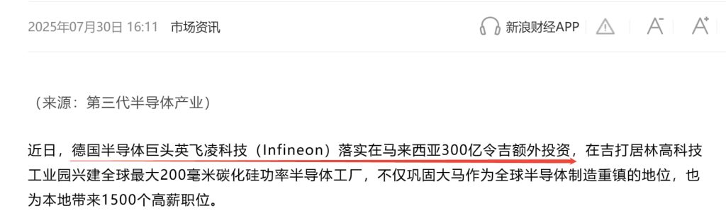 2026年1月22日,全球资管巨头贝莱德(BlackRock)旗下的HPS Investment Partners宣布了其在亚洲的首笔投资—向马来西亚物流独角兽Teleport注资 5000万美元。而在北部的吉打州,半导体巨头英飞凌(Infineon)已于2025年7月启动了全球规模较大的200mm碳化硅(SiC)功率晶圆厂,豪掷 300亿令吉。