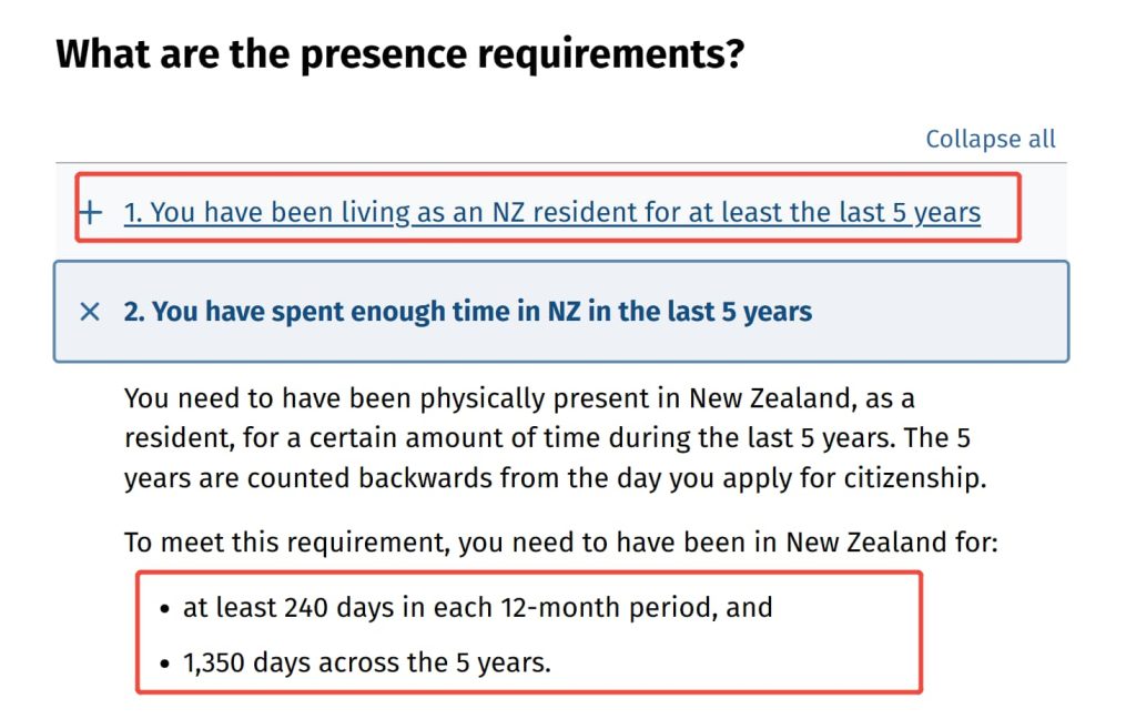 1. 在递交申请前的过去五年内,已在新西兰合法居住累计满1350天,且每年居住时间不少于240天;