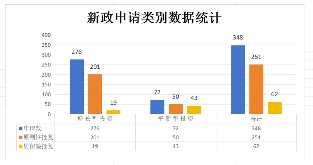 截至9月25日,共收到348份申请,其中增长型投资类别以276份占据主流,平衡型投资类别为72份。目前已有251份申请获得原则性批准,其中62份已成功获批居留签证。