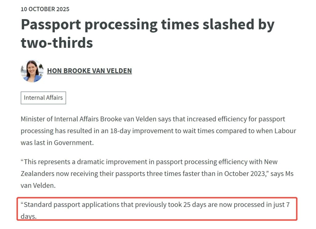 新西兰内政部部长 Brooke van Velden 10月10日指出,该国护照处理效率较上届工党政府时期显著提升,平均等待时间缩短了18天。