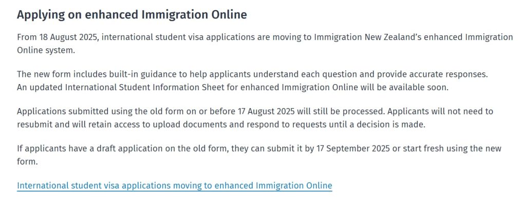 2025年8月18日起,新西兰国际学生签证申请全面迁移至增强版移民在线系统(Enhanced Immigration Online),新系统覆盖六类学生签证:英语语言学习签证、交换生签证、付费留学生签证、过桥学生签证、新西兰政府奖学金签证、外国政府资助学生签证。