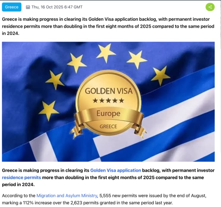2025 年希腊黄金签证迎来重大利好,前 8 个月居留许可发放量达 5555 份,同比暴涨 112%,近乎 2024 年同期两倍。这源于希腊官方推进审批程序数字化改革、增加人力,加速清理过去两年积压的申请,未来数月积压量将持续下降,投资者无需久候。